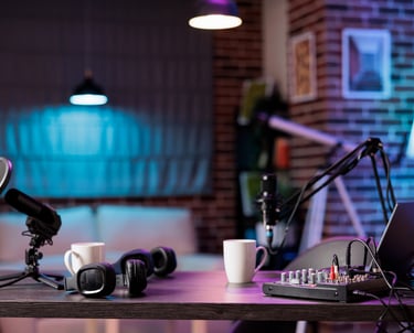 Contamos com um estúdio de podcast profissional — completo, moderno e com estrutura de alto padrão — ideal para gravações e transmissões ao vivo, disponível para locação por criadores de conteúdo, empresas ou instituições.